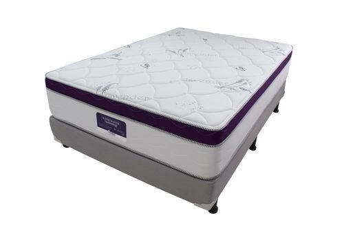 Colchón con nueva tela importada tratada con aloe vera, suave y fresca, cuyas propiedades calmantes y relajantes te aseguran un descanso refrescante y reparador. Con tratamiento higiénico y antialérgico, protege contra microorganismos a lo largo del tiempo. Utilizable en ambos lados, incluye un 50% de refuerzo interno, refuerzo perimetral y resortes Bonnell que garantizan soporte duradero. La refaja está confeccionada en una elegante combinación de telas. La base acolchonada cuenta con espuma de alta densidad, marco de madera curado y secado al horno, y tela mimic importada. Incluye protectores en las esquinas y una refaja antideslizante con bordados multiquilter. Garantía de 10 años.